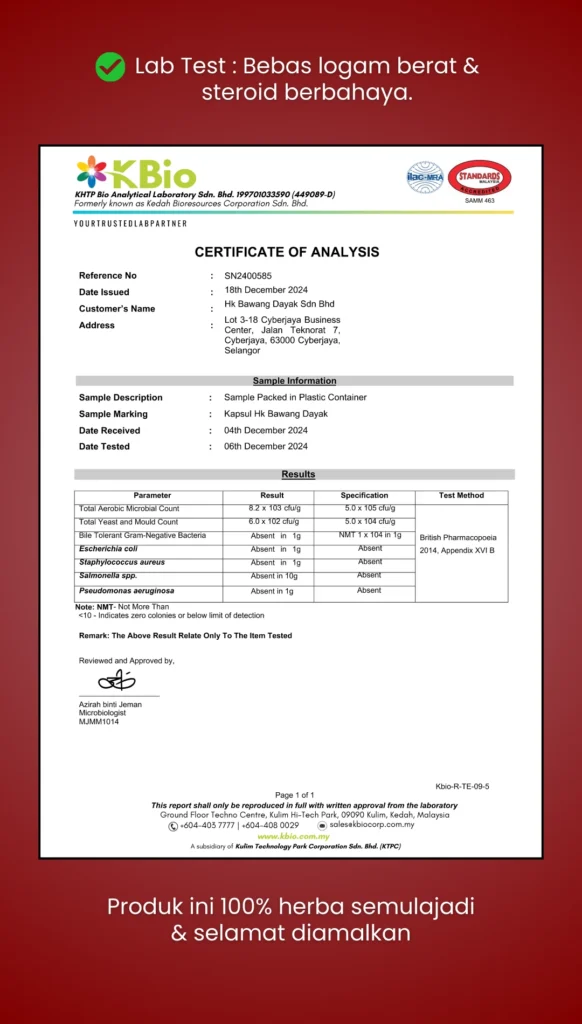 Produk ini adalah suplemen herba. Minum air secukupnya setiap hari dan jarakkan 1-2 jam dengan suplemen lain. Kesan berbeza bergantung bagi setiap individu.